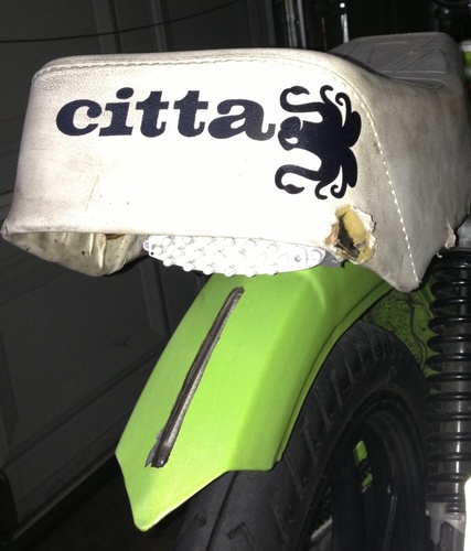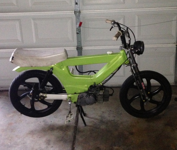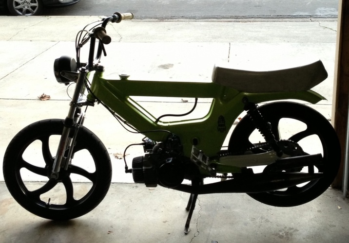 Frame welded and painted Lamborghini green by Kile Brekke. Holds roughly 1.25 gallons. Tomos mags, so no pedaling, sorry bro! Sold off to the museum of Tyler Brekke...