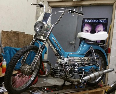 I got this bike in a trade. I traded a pair of Soma 456 Track Drop bicycle handlebars, and Campagnolo Pista crankset for it. I dont thinkni have a pic of this bike before i painted it, but it had wrecked mismatched forks and a factoru gold paint job. I've got some new Atomic clutch shift pucks in there and some new Gazelles mounted on the rims. I stripped the bike down for this past year's CBBG and powder coated it (Thanks Chad Burke!) With a Hero kit from Detroit Moped Works, a hand made Rev Run pipe by Jay Foyt, and every chrome piece for a Puch Maxi I could find on Treats - this bike is finally together. A regearing and some riding is all that is left to do on this bike! A special thanks to Andy Scouted for his help over the course of this project.