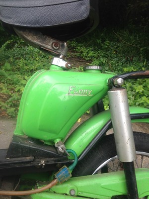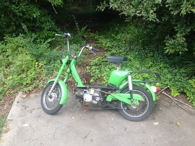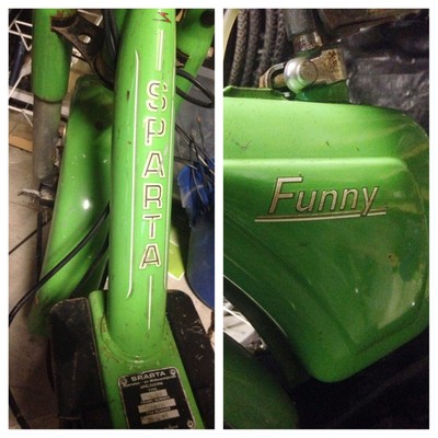 This is one of Freddie's Imports, made in Holland. It's actually the Sparta "Funny" not the Happy mini, though it shares the same frame as the Happy Mini. Basically it's a 3 part frame, The front section's a tube frame with the forks and 12in wheel, it bolts into the middle which holds the moto and subframe, and that then bolts into the rear with the seat and rack. The Happy Mini's have the tank on the front downtube, whereas the Funny has a bare front downtube, and a different rear section that includes the tank under the seat.