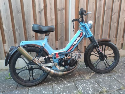 Derbi Variant BRK racing cylinder, selletra ignition, Yasuni R2 exhaust, Reed valve on the engine cases and pull starter.