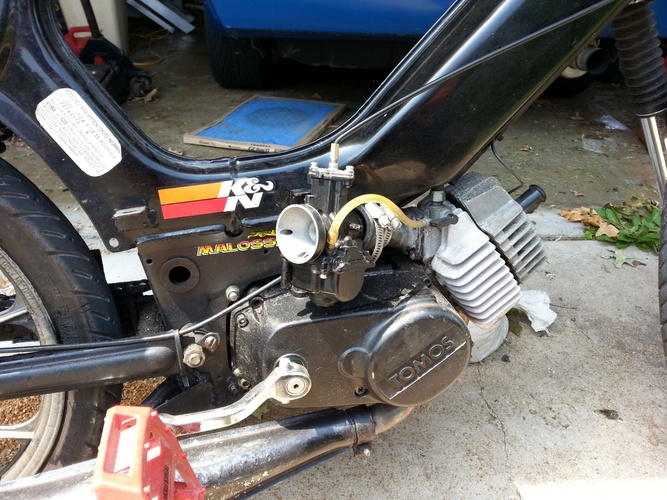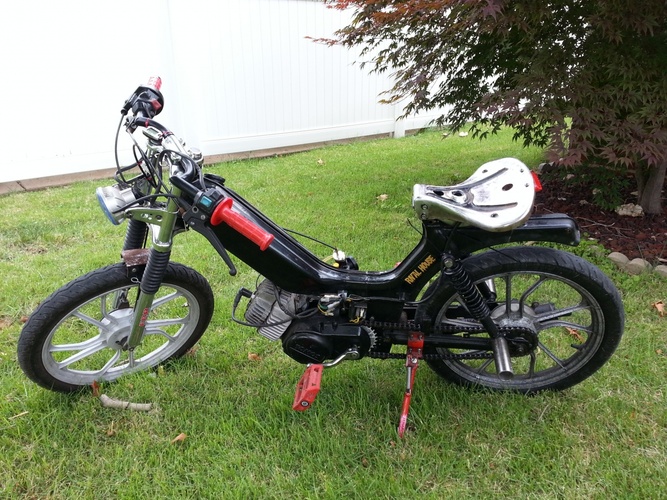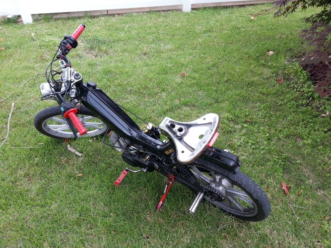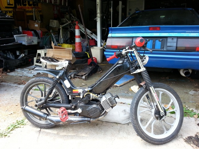 2001 tomos sprint, custom stripped and mounted vespa bravo seat w integrated taillight, round weird headlight, M bars, EBR fork, magura throttle, demolition bmx pedals, dk bmx titanium pegs, custom intake, 28t front sprocket, stock rear. It's greasy, dirty and ridden often. never finished but running good for now, I've gps'd 50mph on it and I weigh 250lbs...