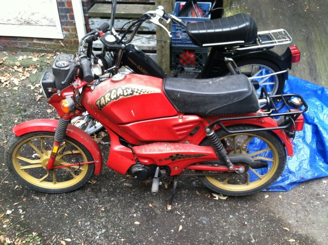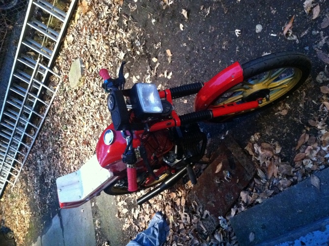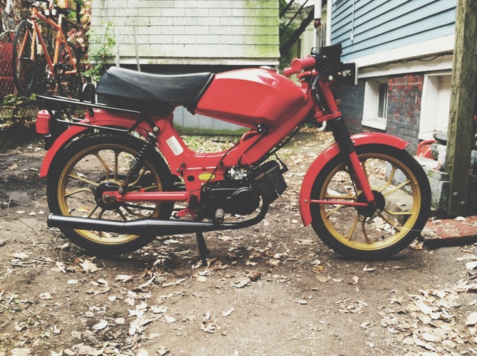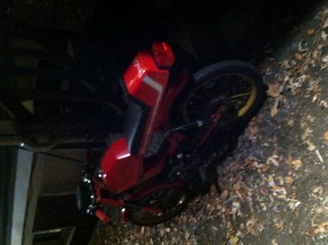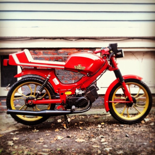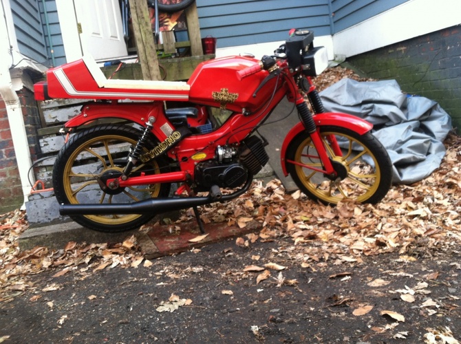 Cleaned her up and such, new gaskets, carb, pipe. Made a fancy cafe seat from a Sachs Prima tail end. Did 47mph once on Storrow Drive in Boston at 3am
