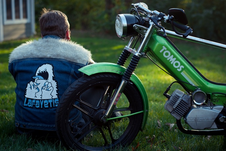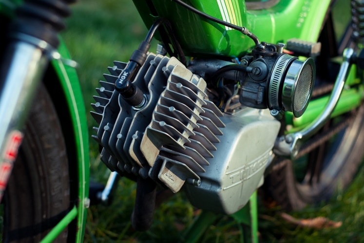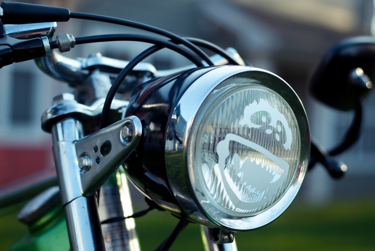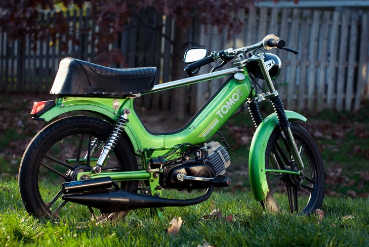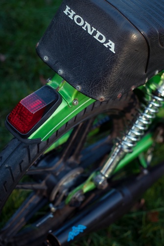 Modest build. Fuel efficient. Super comfy. 28x20 gearing. Bosch 6v points ignition. Dailem intake. Carbon fiber reeds. High comp head. EBR Crossbar and Forks. Hobbit long seat. Beefy shocks. M Bars. Using Puch handlebar clamps as risers actually help make the bike alot more comfortable to ride. Mounted switched into the speedo delete on the headlight. One is for lights and the other is a kill switch. Chopped the rear fender for a more aggressive look. Not the fastest but it can keep up. Hits high 40s. Old style decals remind me of the Sprite logo.