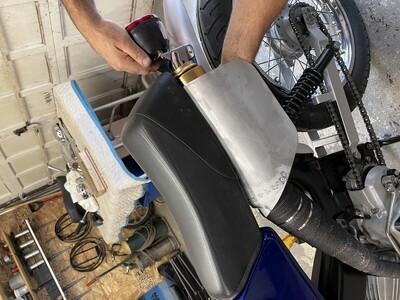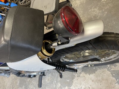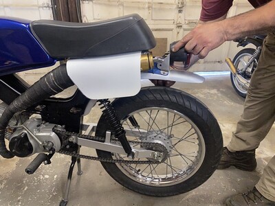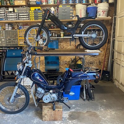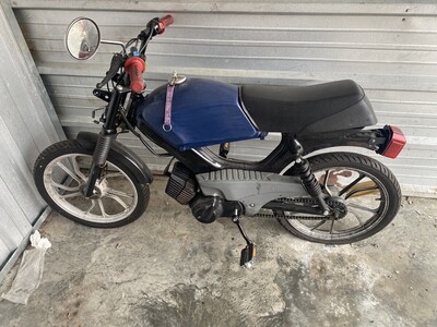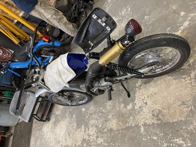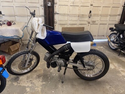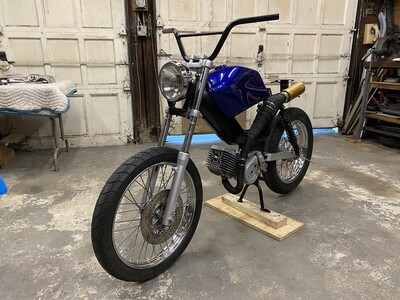 Completely Custom 2004 Top Tank. Forks, Engine, and Swingarm off of a Streetmate Revival. Started life as an LX, and now its Tims Top Tank Tomos (T4). Custom exhaust by welding 2 Bi-Turbo's together to create a tracker-style exhaust.