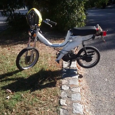 Tomos Streetmate fork assembly. Tomos Revival frame mated to the rear portion of the Towny frame... after the original frame threatened to break in half. Tomos ST Seat mounted with MDF and a door hinge.