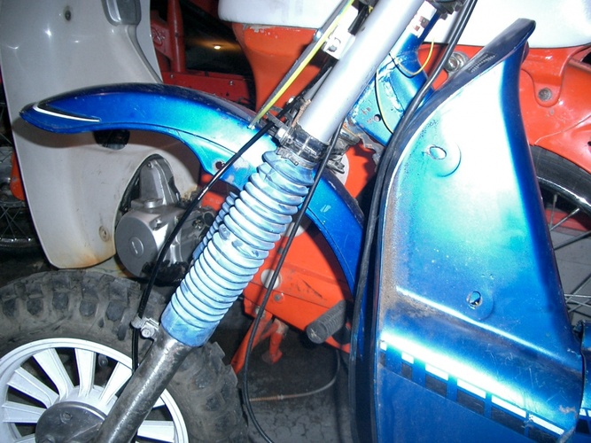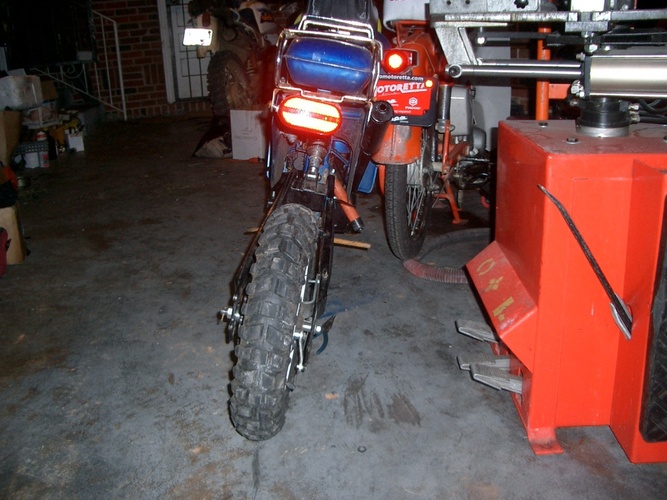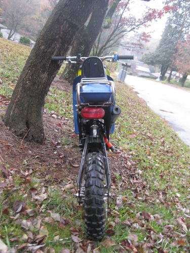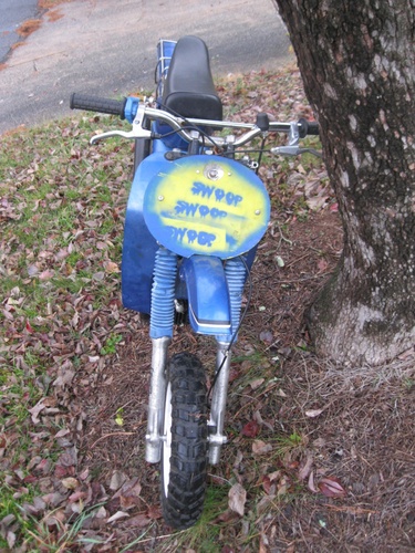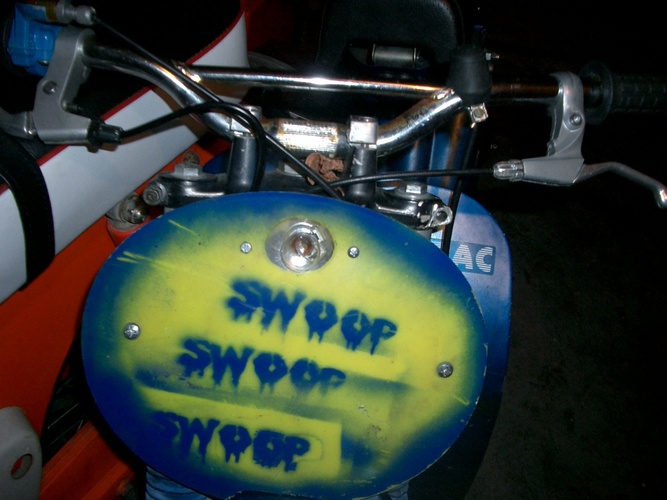 I mounted a number plate on Tracy Byrd using the Supertom's number plate mounts, mounted the trac fender high under the XR80 triple tree and made a headlight mount in it. then spraypainted it gratuitously with SWOOPS (in matching blue of course)