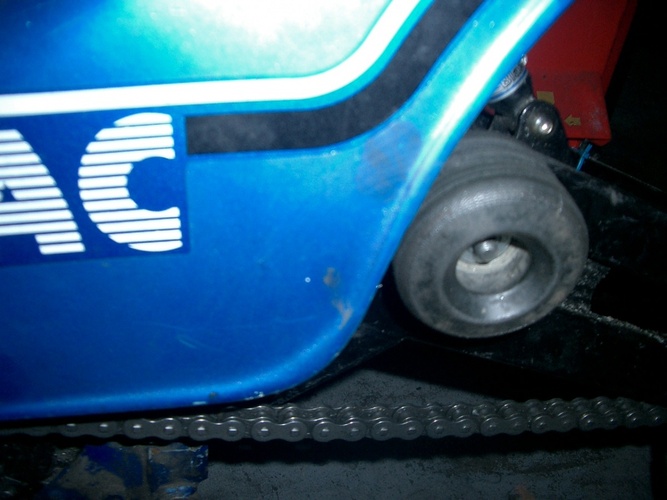 The chain line/tension was a bitch on Tracy Morgan, so I wound up making a skateboard wheel tensioner (with a blue matching wheel WOWOWOW)