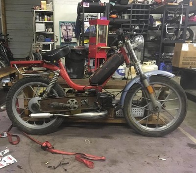 As you can clearly see this was a trash build, aka all the parts were laying around the shop, I bought a stock 30mph Grande sometime in early 2018, I had helped get it running back sometime in 2014, upon fixing it the subframe broke badly, it was left in a garage until I bought it. Once I bought it, I ran up to DMW for a frame they werent using, grabbed some unused performance parts from old bikes, rebuilt the motor, added a stock Kinetic top end, Malossi pipe, Polini Vario, and slapped it all on a Bravo frame, reusing the Grande rims, and forks, after a quick hardwire, I started the bike up and rode around our shop, being that its winter now, real testing will have to wait for warmer weather, but I expect a healthy 35-37mph out if it, not bad for a pile of trash!