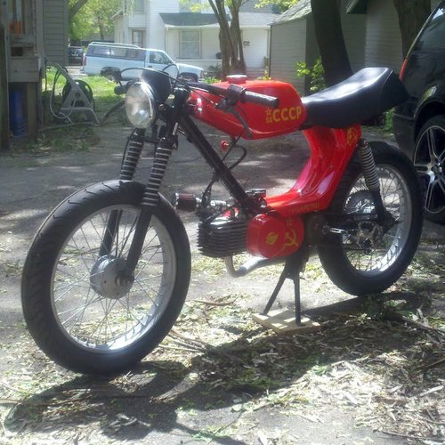 0.25 inch milled off drive-side motor mounts to offset motor and 0.25 inch back sprocket spacer to clear 3.25 inch tire - Seat dropped 2 inches - Frame tail bobbed 6 inches and custom taillight fit.