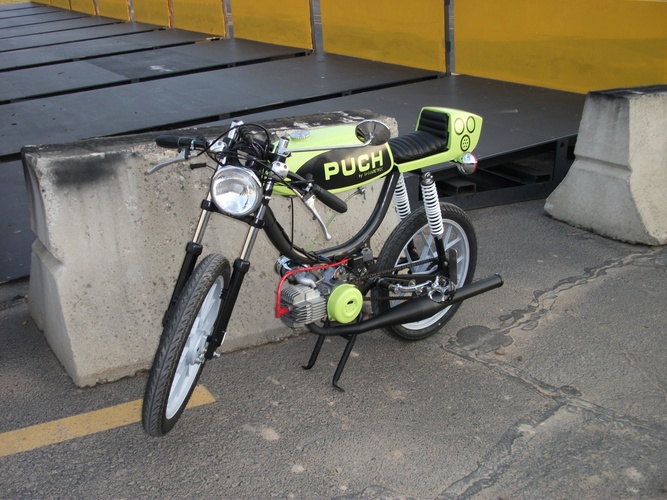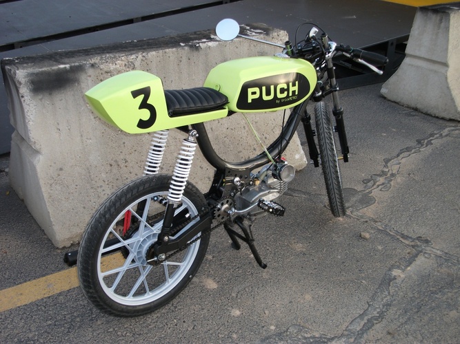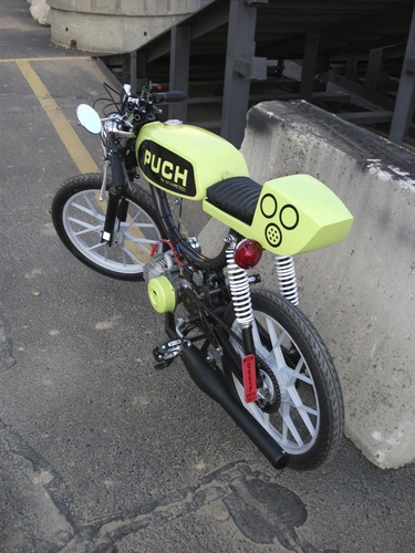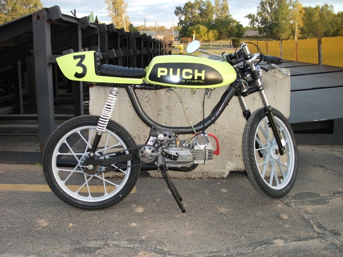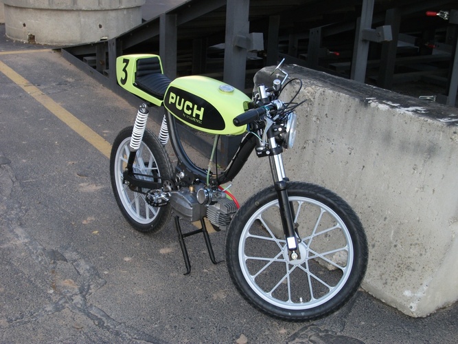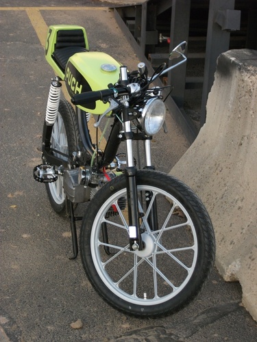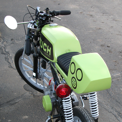 Stripped-down, bumped-up Magnum MK2 - Yamaha TD seat and tail - Motomarini Sebring tank - Triumph headlight - XS650 turn-signal turned tail-light