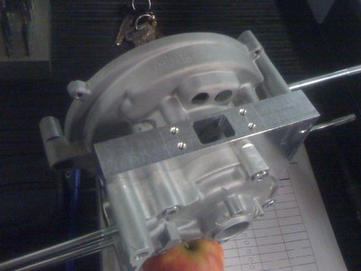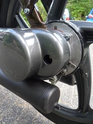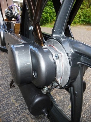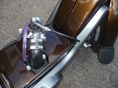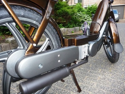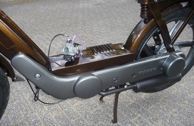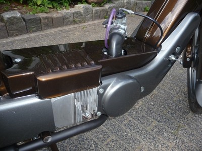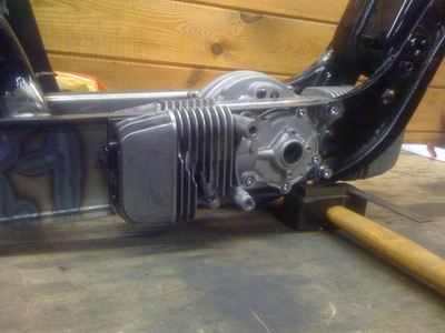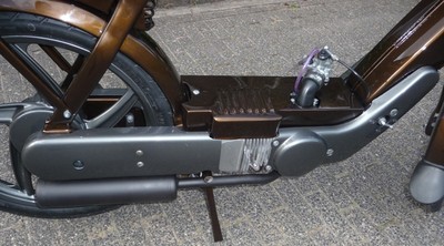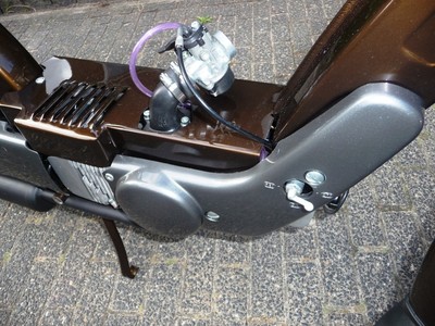 The engine is built up out of two Electronic Ignition Vespa/Piaggio crankcases; one in its original position, with the other crankcase modified, flipped and turned 180 degrees (facing to the rear, so to house the second cylinder). The crankshaft was made up of two stock crankshafts (see pics).