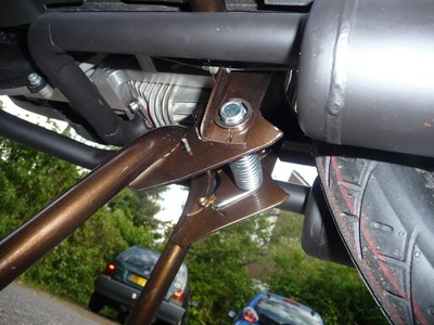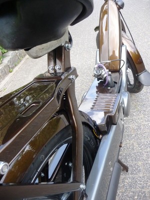 Custom paint. Custom welded stock exhausts. Left and right side panels have been modified. As this bike is "stretched" by about 10cm (4"), two left side panels/covers were used to and welded together to make one elongated side panel.