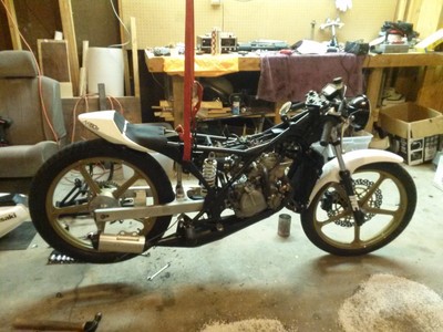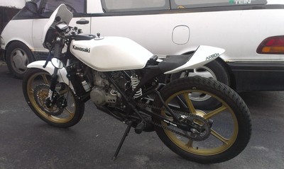 Started life as a stock (missing some parts) ar80. Got it titled and running. Decided to do an engine swap to give it a little more grunt. First did an aircooled kx80 engine. Currently has a liquid cooled kx80 engine. Machined mb5 triple top clamp. My design billet bar clamps. Carbon fiber bars. Nissin twin pot front caliper. Ninja 636 front floating caliper machined to fit. Buell blast headlight fairing made to fit. Quick action throttle. Polini seat made to fit. Custom pipe. Trailtech vapor gauge. Working on an aluminum swing arm.