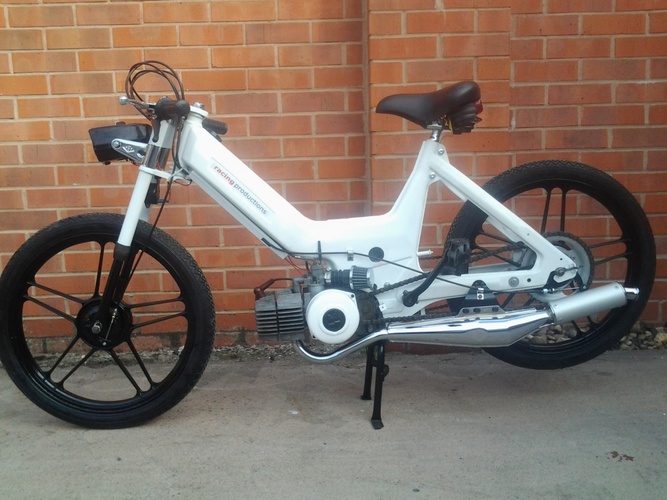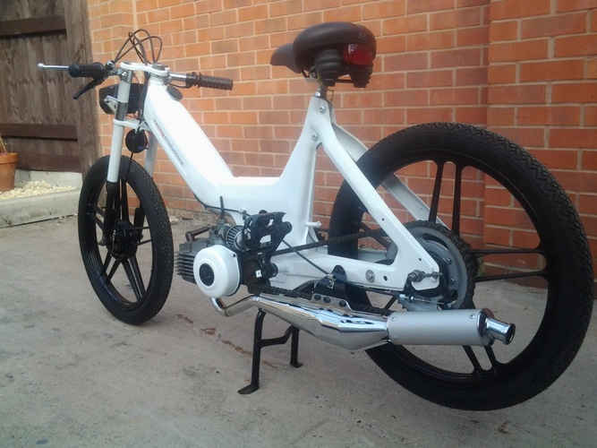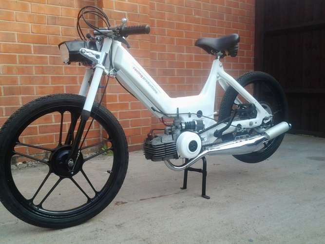 This is my first build of a puch maxi the bike i gave called uno blanco. It was a complete non running basket case . Its has a satin white frame and gloss black wheels i will be building more bike as time goes please chech my website wws. racingproductions.co.uk