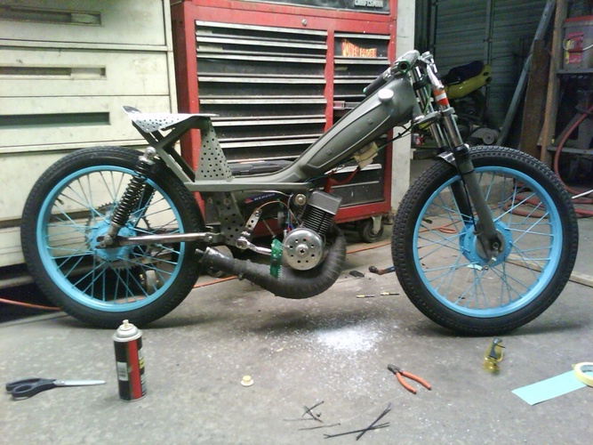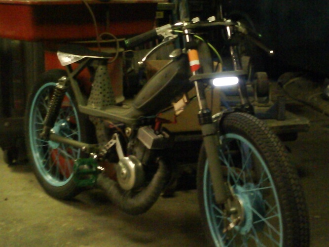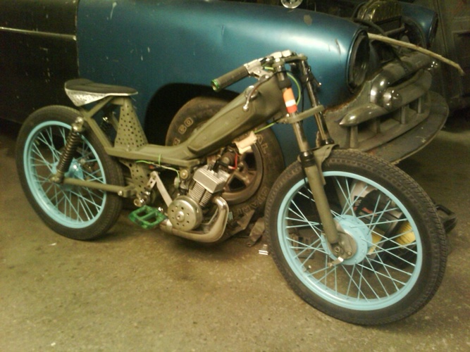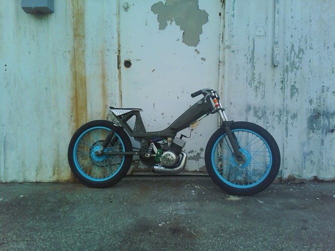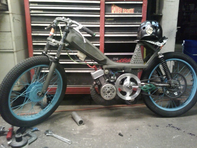 sweet ass motobecane.doppler head Doppler pulley no spring linkage connected straight to the pedals lets me manually variate.also var plus with lightest weights and I drilled a ton of holes in everything.I did all the metal fab work,shortened swingarm,box tubing seat support,concord forks shortened with hacked fender bracket for a stabilizer,primo pedals,polyurethane motor mounts,110 octane race fuel with repsol 2t