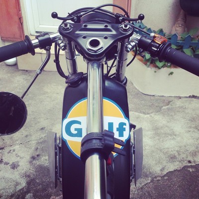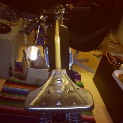 Stock seat, removed leather cover, sanding seat and add varnish on it. Also modify position of seat fixation and add a passage for the renforcing frame bar.