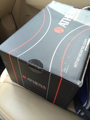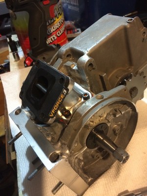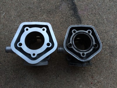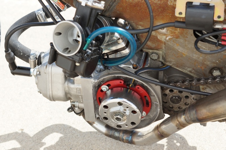 Update: I ended up blowing up this stock KTM 65 cylinder, then put it up for sale. A kid from Chicago bought it then paid me to rebuild the bike like I would want it to be. This bike was built as study of "can this work". Some things needed to be tweaked and fixed or adjusted. KTM 65 cylinders are hard to come by cheap, used, and in good shape. There are 80cc big bores out there but they are expensive, but that is the route that we went. I did the big bore, had to moddify the cases again to clearance the cylinder skirt. I went from a bone stock 2 shoe up to a braced 3 shoe clutch. We added the v-force reeds for the Dio intake. I also did things like add an electric water pump from an older VW Jetta or something & re-plumbed the hoses for better cooling. I then straightened out the swing arm and re-centered the wheel. We also put on new tubes and tires because the originals were old and crusty.