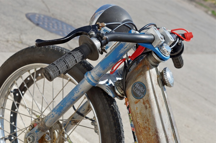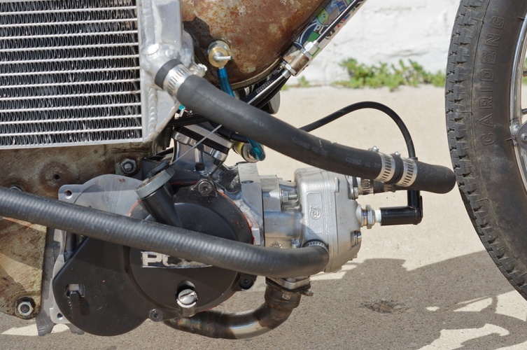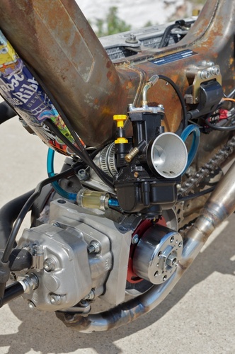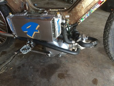 Ok, a "safer" bike. From a distance it looks ratty and crappy, but once you get up to it you notice all the little details, the welding of all the tabs and the exhaust. The changing and welding of bungs on the radiator.