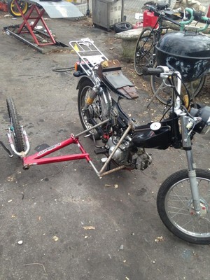 ok, so the bike's totally a joke, but i actually am selling it. use it laugh at it, cut the sidecar off and have a cheap as hell running moped, or just use the motor - fits anything that uses the horizontal honda motors and runs great.