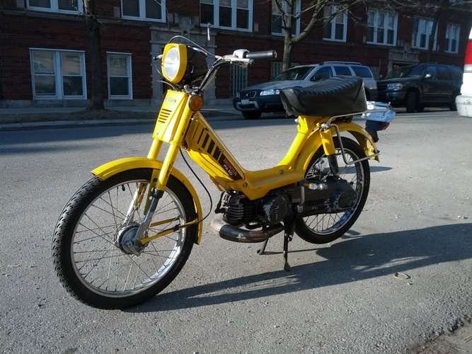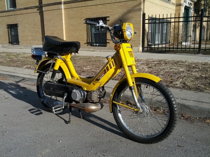The most reliable and best moped inna world on planet earf. Nothing much special about it besides goes fast enough, don't break, is fun. Low stress as all hell: Slightly used DR that already had a bunch of blow-by that still rips (thanks, Bengry). Swapped '83 CDI so no points. Comfy bars off a Pug or something. Pull start, no starter clutch. Stock crank keeps crankin'. Windowed variator with Moped Factory weights. Aftermarket headlight so can easily replace bulbs. Side covers, foot panels, WORKING HORN, yeah do I make you horny, bb? It now has a MLM People's Pipe for noise reduction and build quality, but it was honestly a lot more fun with the Proma. Torque, bb. The ultimate daily rider and rally loaner when your friend's exhaust falls off or something.