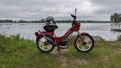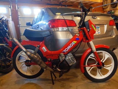 The legendary Fruit Stripe Tomos Sprint! A35 with a 45mm Alukit, Big ol Airsal-style head, Vm20+Malossi 4 petal+Crank intake, Cranked up Crankpipe, Swapped to CDI with the Parmakit box.